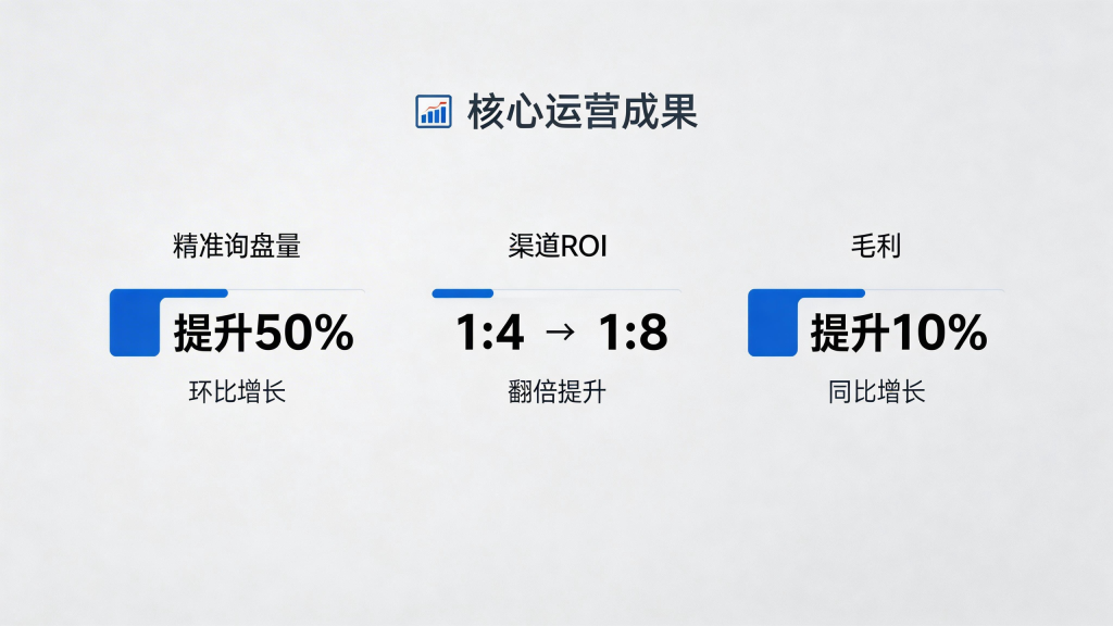 - 渠道ROI:整体ROI从1:4翻倍至1:8,投入减少但营收增长40%。