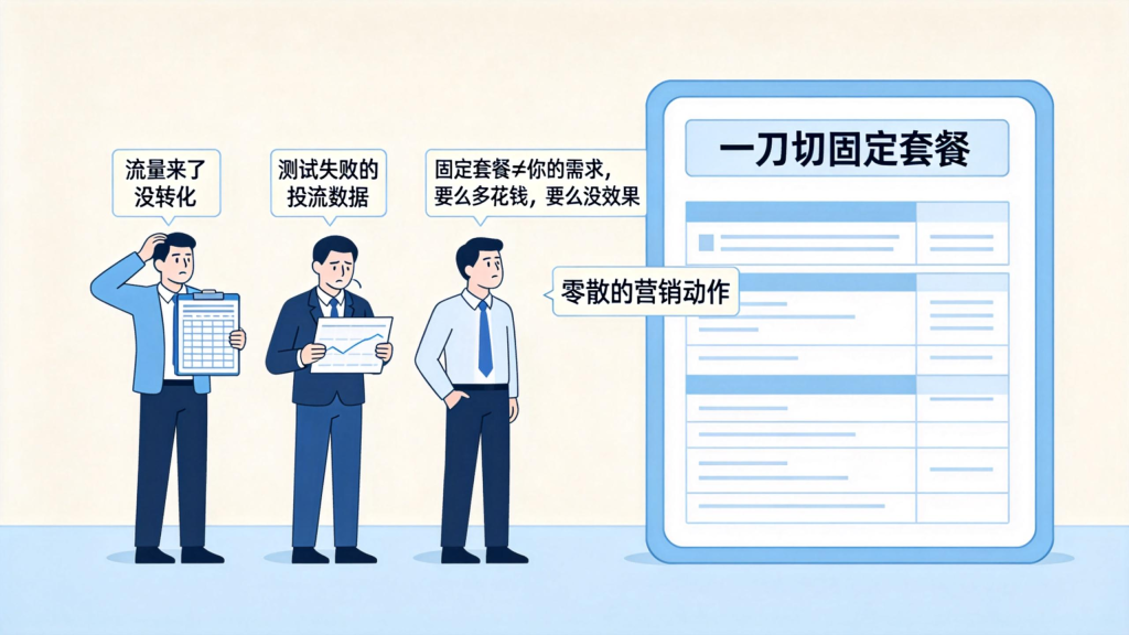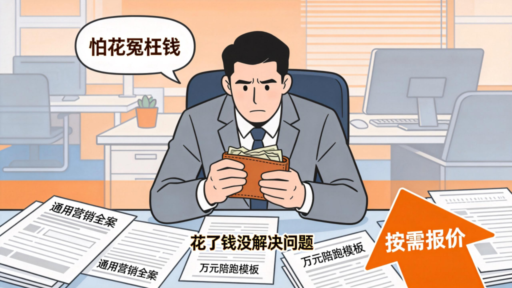 找我咨询的老板中,80% 第一句话就是:“Evan,你这边合作怎么收费?” 但我从不轻易给出固定报价 —— 因为太多老板有过这样的遭遇:花 5 万买了一套“通用营销全案”,结果发现与自身业务格格不入;被“十万级年度服务”的高价吓退,其实他只需要一个 3 天的精准诊断就能找到问题核心;贪便宜选了“万元陪跑”,结果对方只给模板,根本不提供落地支持。