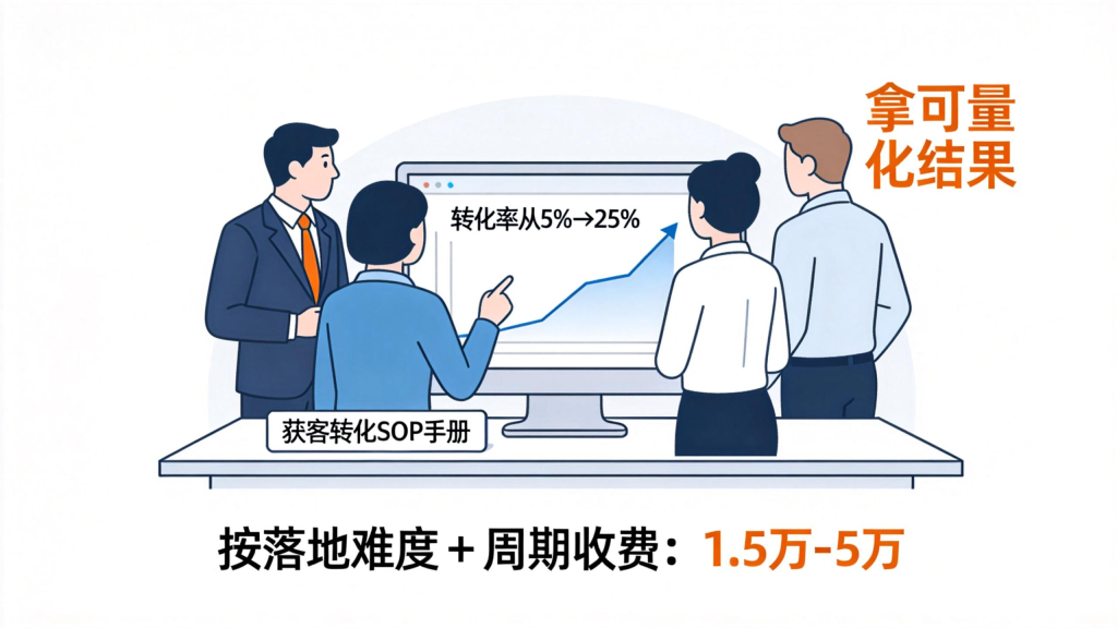 • 收费依据:已明确核心问题,需要有人带领团队落地执行(如优化转化流程、测试获客渠道)。收费根据服务周期(1 个月 / 3 个月)和落地难度(是否需搭建 SOP、是否进行投流测试)而定,区间在 1.5 万 – 5 万。